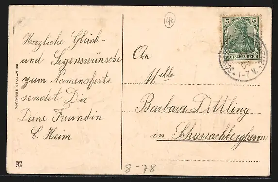 Personenbezogene Daten auf der Rückseite der Karte wurden durch blauen Textmarker unkenntlich gemacht. Die blauen Stellen sind auf die Vorderseite durchgeweicht und wirken sich negativ auf das Postkartenfoto aus