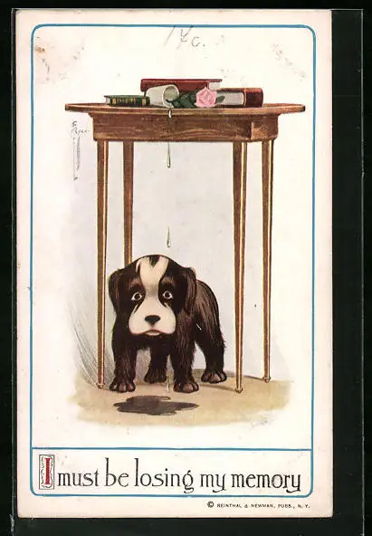 Künstler-AK Kleiner Hund unter Tisch mit umgekippter Vase