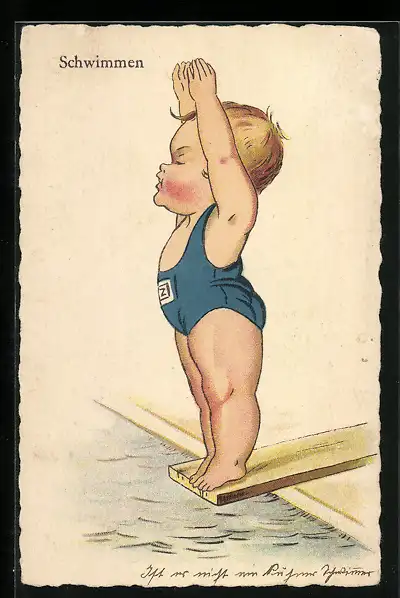 Künstler-AK Kleiner Junge im Badeanzug auf dem Sprungbrett