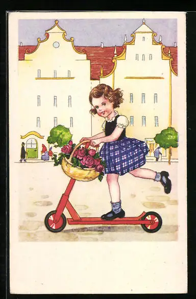 Künstler-AK Kleines Mädchen fährt mit einem Roller