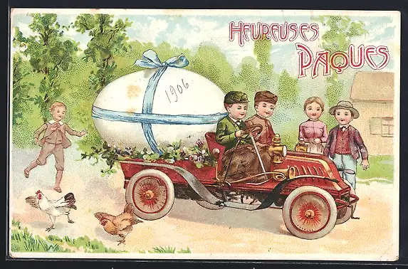 Künstler-AK Kleines Paar im Auto mit Riesen-Ei, Ostergruss