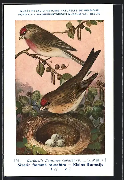 Künstler-AK Kleines Redpoll Pärchen am Nest