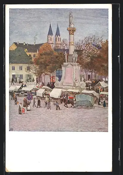 Künstler-AK Klosterneuburg, Buntes Treiben auf dem Markt