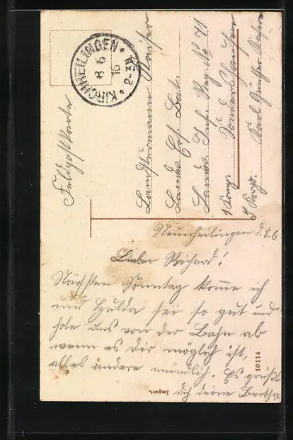 Personenbezogene Daten auf der Rückseite der Karte wurden durch blauen Textmarker unkenntlich gemacht. Die blauen Stellen sind auf die Vorderseite durchgeweicht und wirken sich negativ auf das Postkartenfoto aus