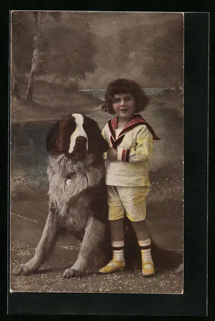 Künstler-AK Knabe mit Bernhardiner vor einer Landschaft