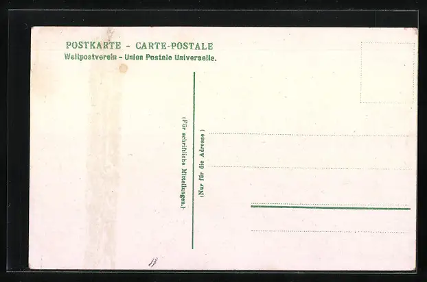 Personenbezogene Daten auf der Rückseite der Karte wurden durch blauen Textmarker unkenntlich gemacht. Die blauen Stellen sind auf die Vorderseite durchgeweicht und wirken sich negativ auf das Postkartenfoto aus