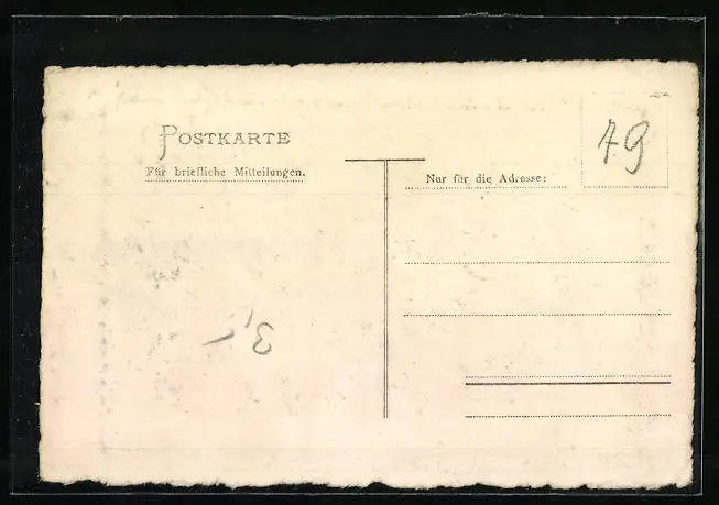 Personenbezogene Daten auf der Rückseite der Karte wurden durch blauen Textmarker unkenntlich gemacht. Die blauen Stellen sind auf die Vorderseite durchgeweicht und wirken sich negativ auf das Postkartenfoto aus