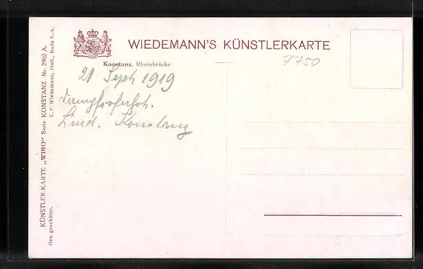 Personenbezogene Daten auf der Rückseite der Karte wurden durch blauen Textmarker unkenntlich gemacht. Die blauen Stellen sind auf die Vorderseite durchgeweicht und wirken sich negativ auf das Postkartenfoto aus