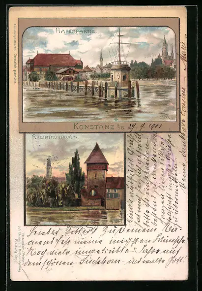 Künstler-AK Konstanz a. B., Hafenpartie und Rheinthorthurm