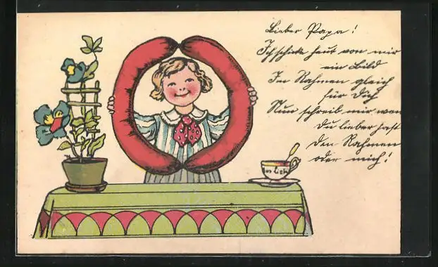 Künstler-AK Kriegsnot, das Mädchen mit einer grossen Wurst