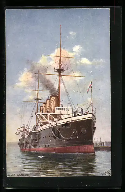 Künstler-AK Kriegsschiff H.M.S. Aboukir in Hafennähe