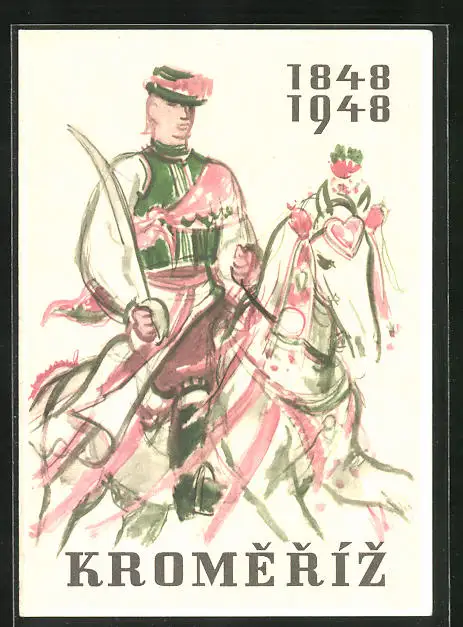 Künstler-AK Kromeriz, Reiter in Tracht mit Säbel, 1948