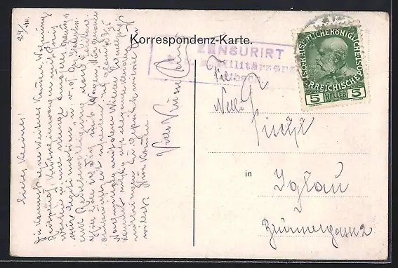 Personenbezogene Daten auf der Rückseite der Karte wurden durch blauen Textmarker unkenntlich gemacht. Die blauen Stellen sind auf die Vorderseite durchgeweicht und wirken sich negativ auf das Postkartenfoto aus