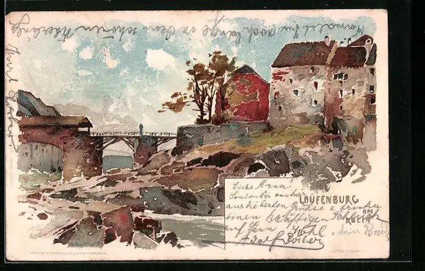 Künstler-AK Laufenburg, Ortspartie mit Brücke