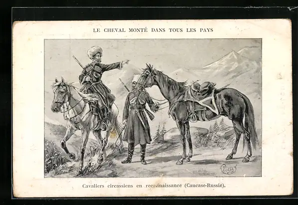 Künstler-AK Le Cheval Monté dans tous les pays, Cavalier cirsassiens en reconnaissance