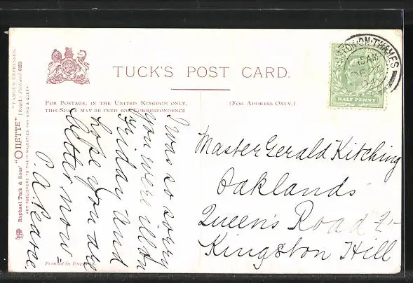 Personenbezogene Daten auf der Rückseite der Karte wurden durch blauen Textmarker unkenntlich gemacht. Die blauen Stellen sind auf die Vorderseite durchgeweicht und wirken sich negativ auf das Postkartenfoto aus
