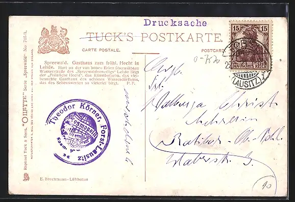 Personenbezogene Daten auf der Rückseite der Karte wurden durch blauen Textmarker unkenntlich gemacht. Die blauen Stellen sind auf die Vorderseite durchgeweicht und wirken sich negativ auf das Postkartenfoto aus