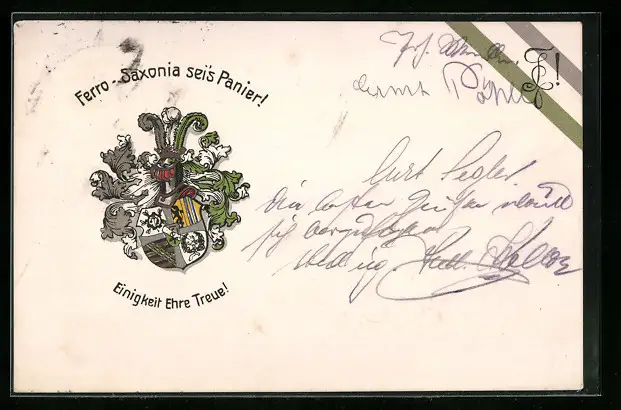 Künstler-AK Leipzig, Ferro-Saxonia sei`s Panier!, Ritterhelm und Studentenwappen