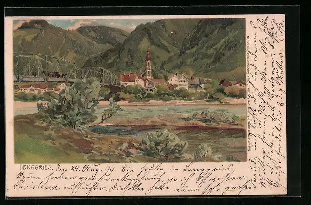 Künstler-AK Lenggries, Ortspanorama mit Brücke