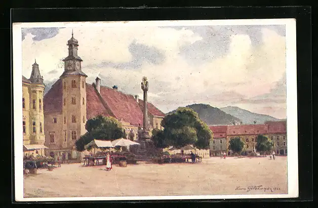 Künstler-AK Leoben, Hauptplatz mit Denkmal