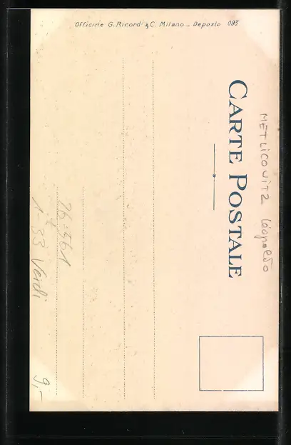 Personenbezogene Daten auf der Rückseite der Karte wurden durch blauen Textmarker unkenntlich gemacht. Die blauen Stellen sind auf die Vorderseite durchgeweicht und wirken sich negativ auf das Postkartenfoto aus