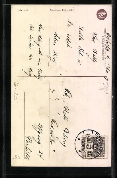 Personenbezogene Daten auf der Rückseite der Karte wurden durch blauen Textmarker unkenntlich gemacht. Die blauen Stellen sind auf die Vorderseite durchgeweicht und wirken sich negativ auf das Postkartenfoto aus