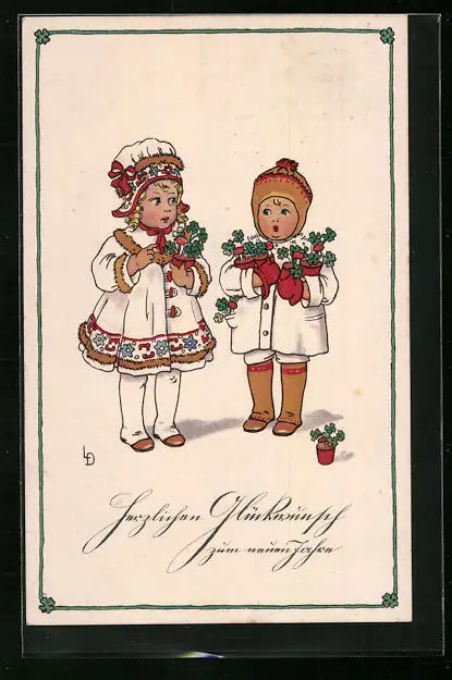 Künstler-AK Lia Döring: Kinder mit eingetopftem Klee