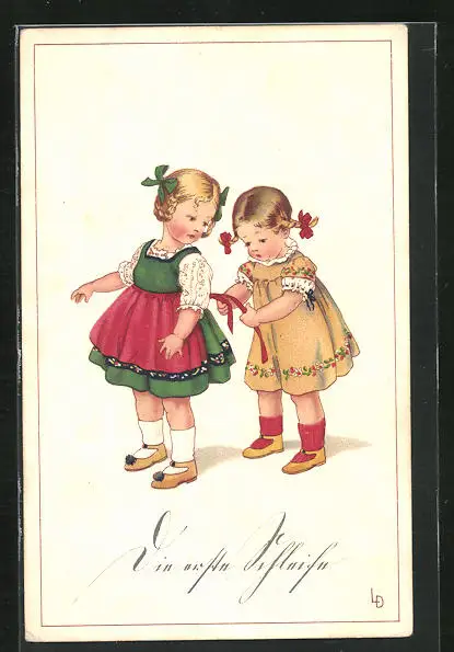 Künstler-AK Lia Döring: Zwei kleine Mädchen helfen sich beim Anziehen