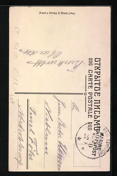 Personenbezogene Daten auf der Rückseite der Karte wurden durch blauen Textmarker unkenntlich gemacht. Die blauen Stellen sind auf die Vorderseite durchgeweicht und wirken sich negativ auf das Postkartenfoto aus