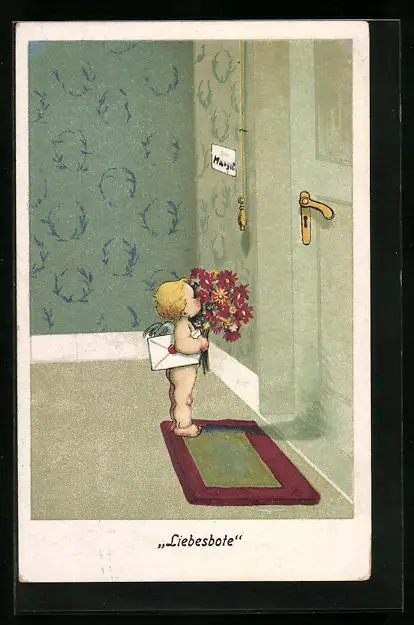 Künstler-AK Liebesbote Amor mit Blumen und Liebesbrief