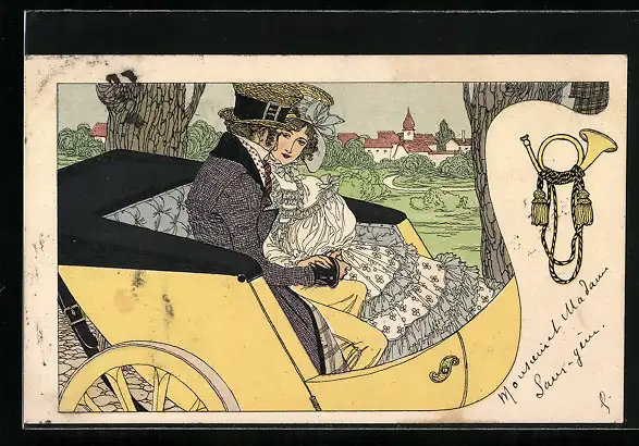 Künstler-AK Liebespaar fährt in einem Auto, Jugendstil
