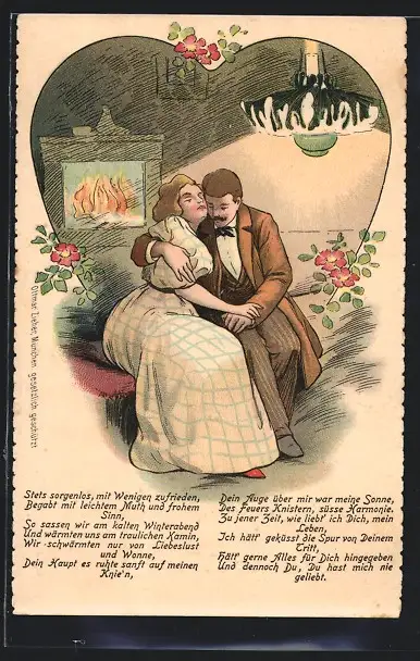Künstler-AK Liebespaar sitzt am Kamin, Gedicht