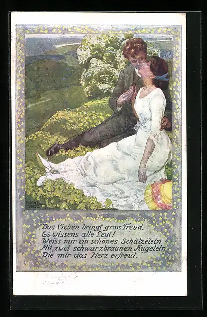 Künstler-AK Liebespaar sitzt auf einer Wiese