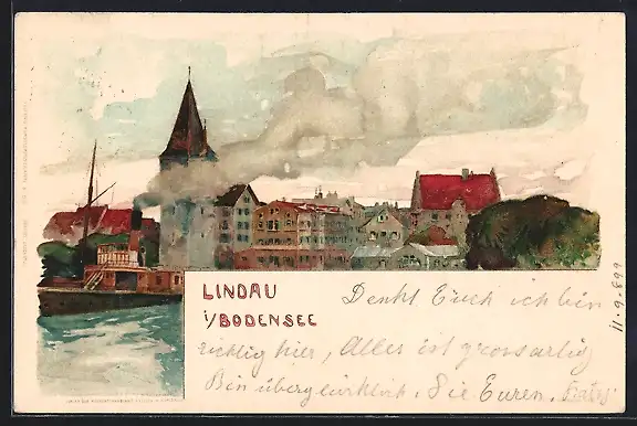 Künstler-AK Lindau, Dampfer vor der Stadt auf dem Bodensee