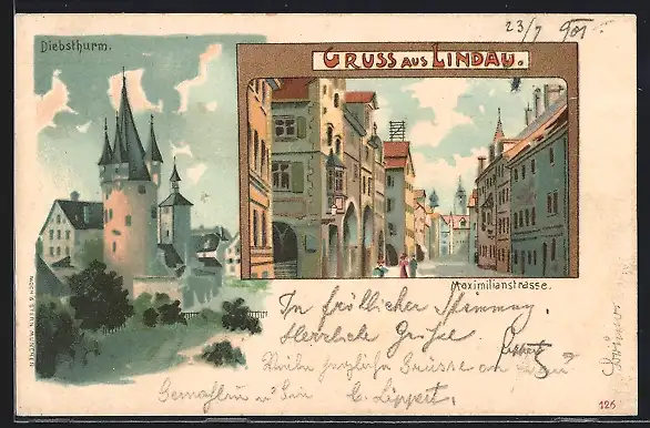 Künstler-AK Lindau i. B., Maximilianstrasse, Diebsturm - Neujahrsgruss