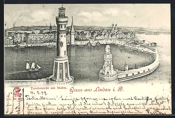 Künstler-AK Lindau i. B., Totalansicht mit Hafen