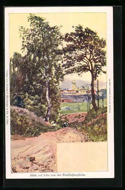 Künstler-AK Linz /Donau, Blick auf Linz von der Pöstlingbergbahn