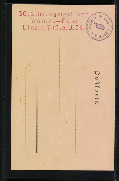 Personenbezogene Daten auf der Rückseite der Karte wurden durch blauen Textmarker unkenntlich gemacht. Die blauen Stellen sind auf die Vorderseite durchgeweicht und wirken sich negativ auf das Postkartenfoto aus