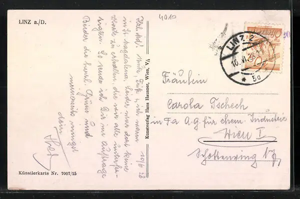 Künstler-AK Linz a. D., Strassenbahn am Franz-Josef-Platz