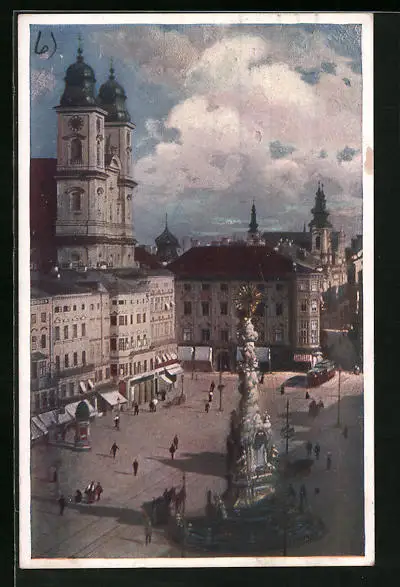 Künstler-AK Linz a. d. D., Strassenbahn auf dem Franz Josefs-Platz