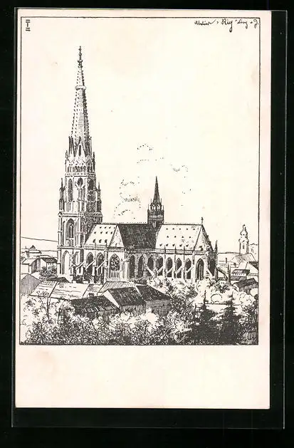 Künstler-AK Linz a. d. Donau, Dom und Umgebung