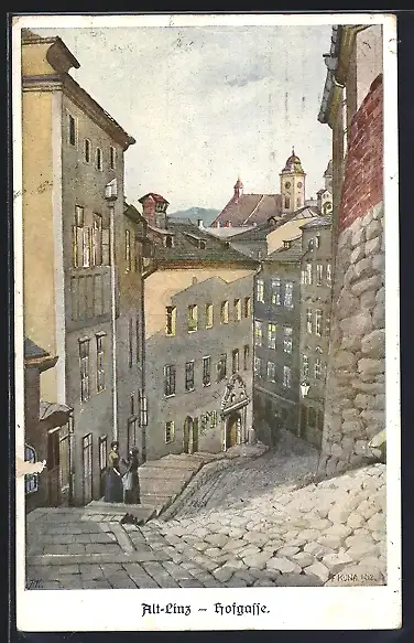 Künstler-AK Linz a. d. Donau, Frauen im Gespräch in der Hofgasse der Altstadt