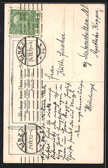 gelaufen 1913, Eckknick re. oben, guter Zustand