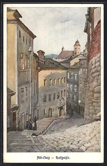 Künstler-AK Linz a. d. Donau, Strassenpartie der Hofgasse in der Altstadt