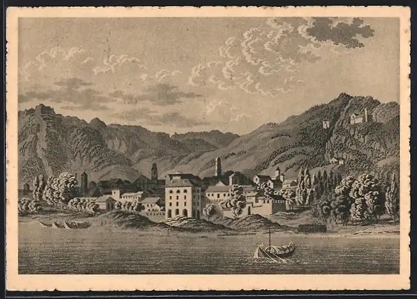 Künstler-AK Locarno, Uferpartie mit Boot