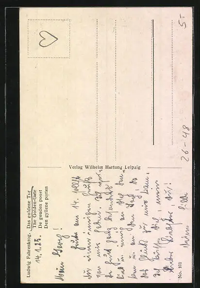 Personenbezogene Daten auf der Rückseite der Karte wurden durch blauen Textmarker unkenntlich gemacht. Die blauen Stellen sind auf die Vorderseite durchgeweicht und wirken sich negativ auf das Postkartenfoto aus