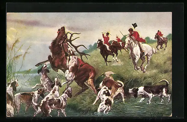 Künstler-AK Ludwig Fromme: Treibjagd, Meute mit Hirsch