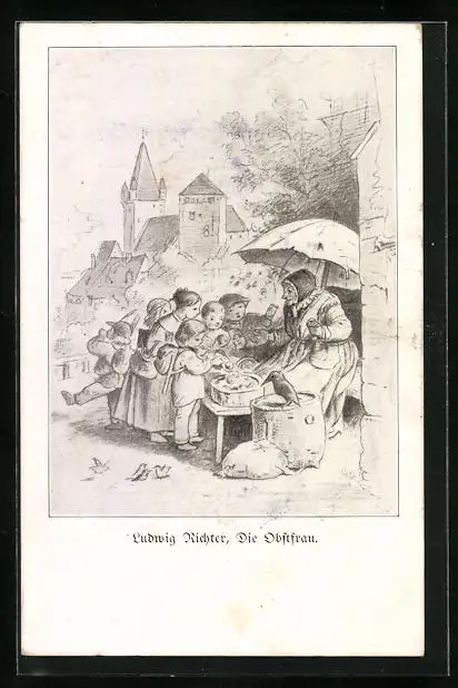 Künstler-AK Ludwig Richter: Die Obstfrau mit einer interessierten Kinderschar