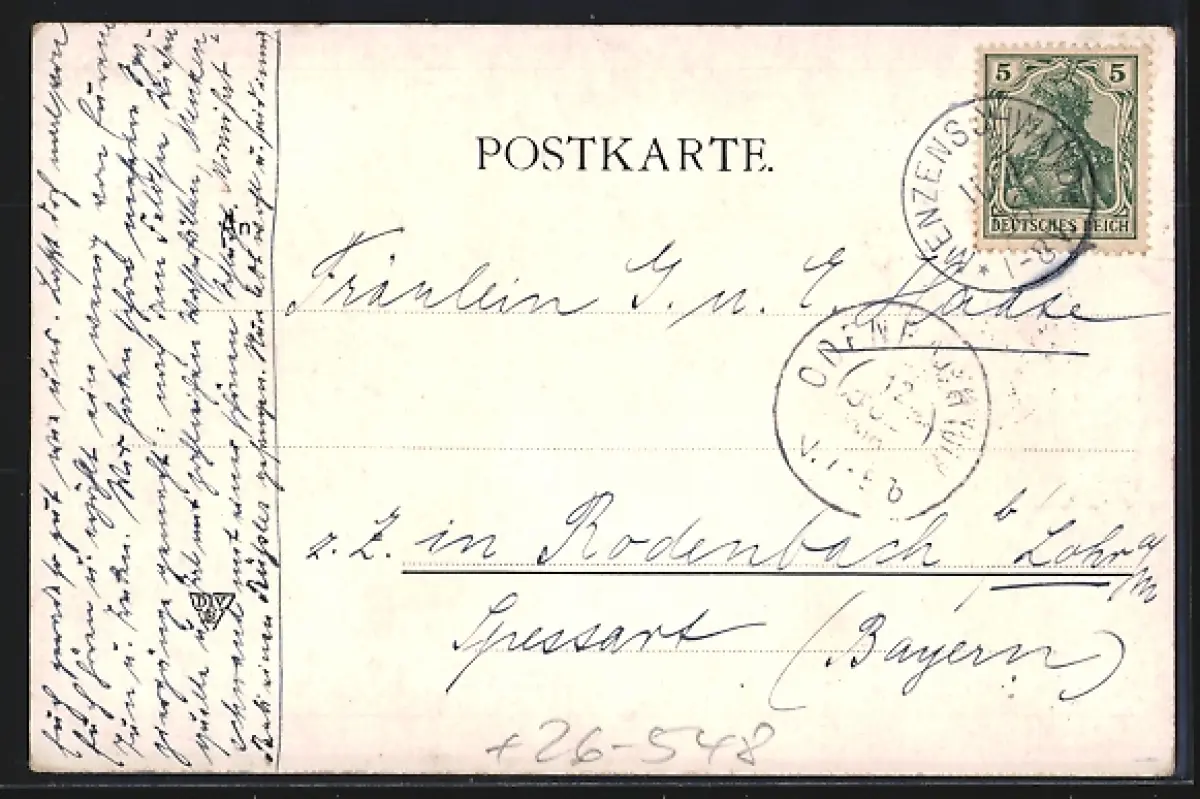 Personenbezogene Daten auf der Rückseite der Karte wurden durch blauen Textmarker unkenntlich gemacht. Die blauen Stellen sind auf die Vorderseite durchgeweicht und wirken sich negativ auf das Postkartenfoto aus