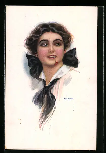 Künstler-AK Luis Usabal: Frau mit Haarschleife und Kirchen